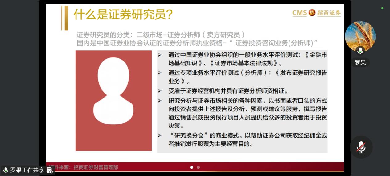 2025年12月5日, 招商证券 国家级投教基地携手 南方科技大学 ,为金融专业学生带来一场题为《证券研究员成长指南:工作流程与职业进阶》的专题课程。本次课程由 招商证券 财富管理部总部投资顾问罗果担任主讲,系统剖析了证券研究行业的工作流程、能力体系与职业成长脉络,为学子们揭开了卖方研究工作的神秘面纱。