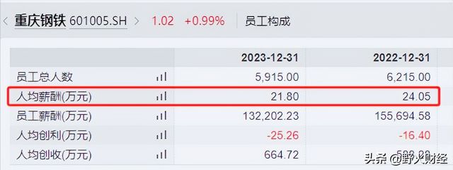 去年末,重庆钢铁员工总数5915人,比2022年末少300人,去年虽然人均创收近665万元,但人均创利为-25万元,人均薪酬也受到影响,从24万元减少到21.8万元,但是仍然高于2021年的大约20万元人均薪酬。