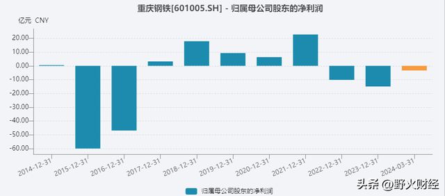 2021年,重庆钢铁还实现归母净利润22.7亿元,2022年转眼就亏损10.2亿元,2023年继续亏损14.9亿元,最近两个完整财年亏损超过25亿元。