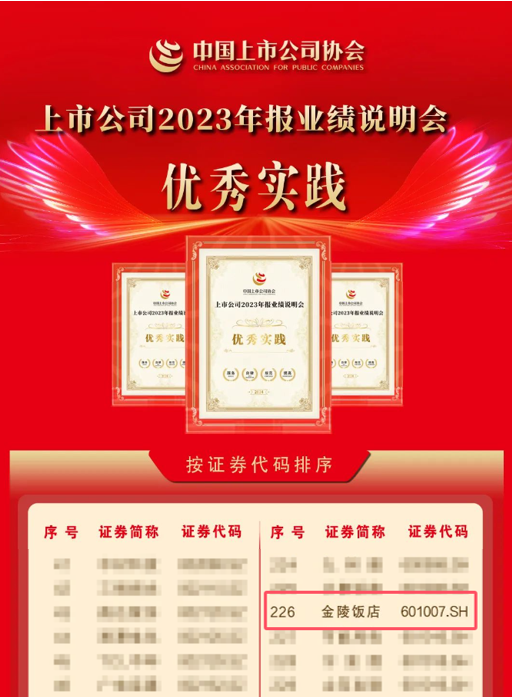 2024年12月3日,中国上市公司协会(以下简称“中上协”)正式公布了“2023年报业绩说明会优秀实践”名单,金陵饭店(SH.601007)再次荣获年报业绩说明会优秀实践榜单的殊荣。此项荣誉不仅彰显了金陵饭店在投资者关系管理的卓越表现,同时也体现了公司对于增进与投资者沟通、传递企业价值的努力。