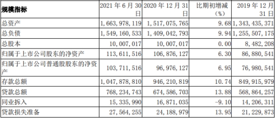 截至2021年6月30日,南京银行总资产为16639.78亿元,比上年末增长9.68%;总负债为15491.61亿元,比上年末增长9.94%。其中,南京银行的贷款总额为7682.35亿元,比上年末增长13.88%;存款总额为10478.79亿元,比上年末增长10.74%。
