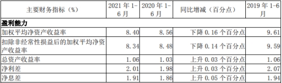 2021年1-6月,南京银行加权平均净资产收益率为8.40%,比上年同期下降0.16个百分点;扣除非经常性损益后的加权平均净资产收益率为8.34%,比上年同期下降0.14个百分点。