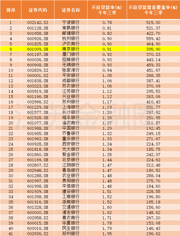 在A股上市城商行中,南京银行不良贷款率仅次于宁波银行和杭州银行,且与杭州银行差距仅为0.01个百分点。同时,截至三季度末,南京银行拨备覆盖率接近400%,在41家上市银行中排名第10,在同业中保持相对领先。