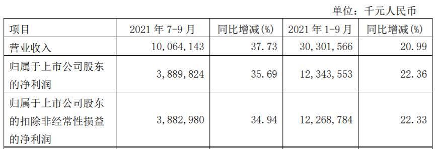 2021年前三季度,该行实现营业收入303.02亿元,同比增长20.99%;实现净利润123.44亿元,同比增长22.36%。
