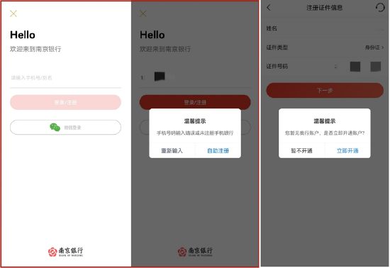 注册方面,南京银行App支持本行/非本行用户注册。其中,本行用户输入手机号+验证码、填写证件和卡号信息、设置密码后即可完成注册;非本行用户可以在线开通电子账户。注册旅程比较顺畅,但暂未实现注册与绑卡的分离。