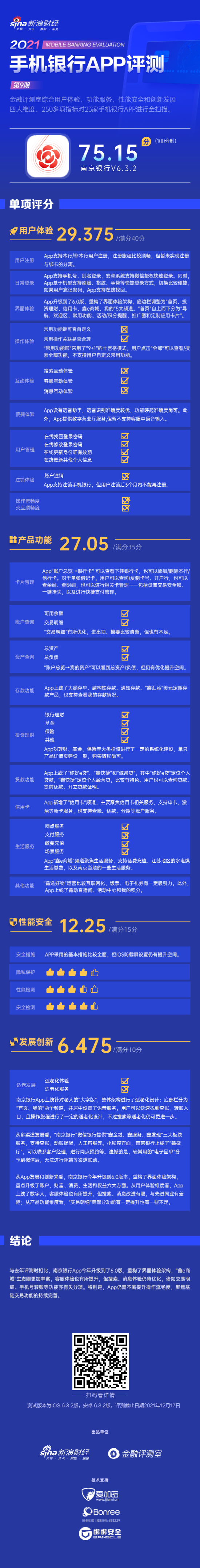 金融评测室综合用户体验、产品功能、性能安全、创新发展4大维度,250余项细分指标对南京银行手机银行APP“南京银行”进行全扫描,最终给予75.15分(总分100)。