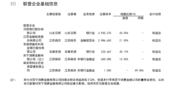 公开资料显示,2015年,南京银行与苏宁云商、法巴个人金融集团、洋河股份及先声再康共同发起设立苏宁消费金融有限公司。该公司是江苏首家专注于消费金融领域的非银行金融机构。截至2020年年末,该公司注册资本6亿元,资产总额25.42亿元,净资产7.20亿元,全年实现净利润0.08亿元,南京银行对其持股比例为15%。