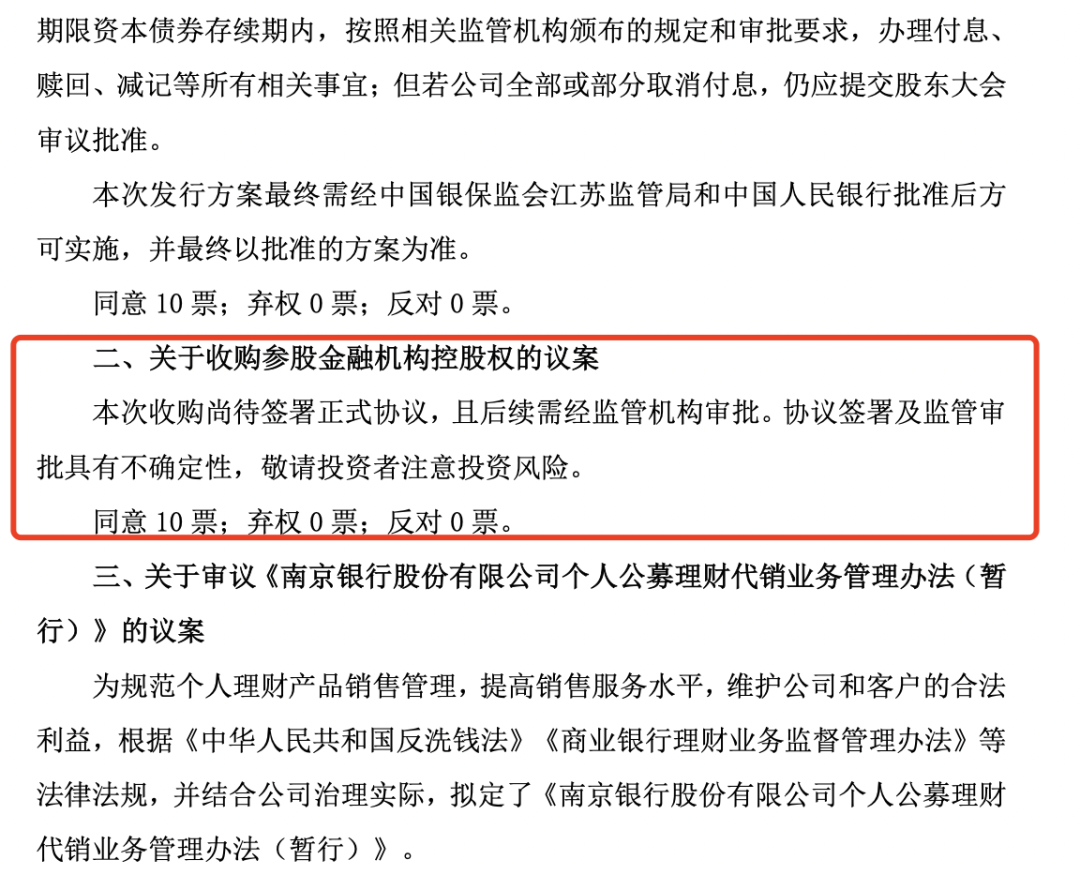 南京银行13日晚间公告了其第九届董事会第九次会议决议公告。除了公告该行获批发行不超过人民币200亿元的无固定期限资本债券之外,该行表决和通过了一项关于收购参股金融机构控股权的议案。