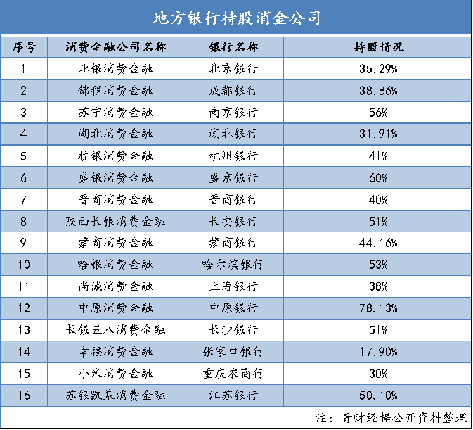 截止目前,我国共有30家消费金融公司。其中具有全国性银行背景的消费金融公司有5家;有地方性银行背景的消费金融公司有16家,包括北京银行、成都银行、杭州银行、盛京银行、晋商银行、长安银行、蒙商银行、哈尔滨银行、上海银行、中原银行、长沙银行、张家口银行等。