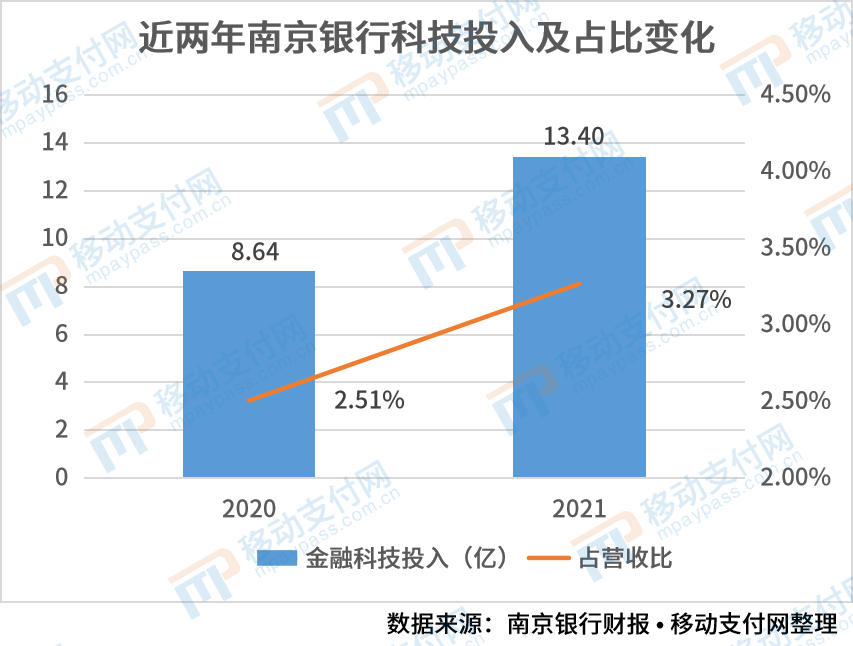 年报介绍,2021年,南京银行金融科技投入13.4亿元,较2020年增长55%,占营收3.27%,增长0.76个百分点。其中,软硬件投入占比约6:4。