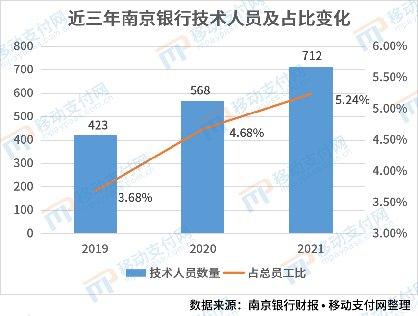 技术人员方面,至2021年底,南京银行技术人员712人,占总员工比为5.24%。