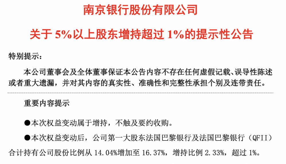 5月18日,南京银行发布公告称,公司收到法国巴黎银行《关于增持南京银行股份有限公司股份的告知函》,法国巴黎银行及法国巴黎银行(QFII)增持公司股份比例超过1%。