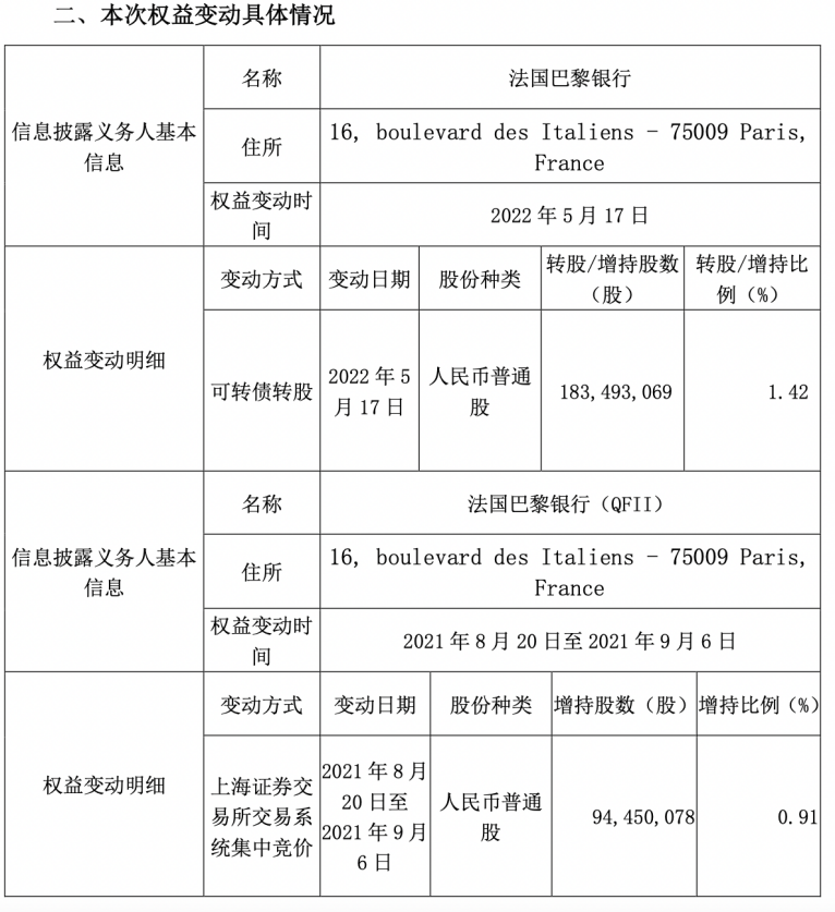 具体来看,法国巴黎银行2022年5月17日以可转债转股方式增持公司股份约1.83亿股,增持比例1.42%;法国巴黎银行(QFII)于2021年8月20日至2021年9月6日期间,以自有资金通过上海证券交易所交易系统以集中竞价交易方式累计增持公司股份约9445万股,增持比例0.91%。上述增持比例合计为2.33%。