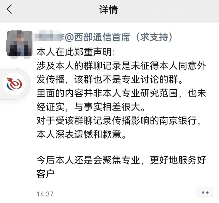 事情搞大了后,首席分析师紧急在朋友圈发了声明:相关群聊记录未征得本人同意外发传播,内容并非其专业研究范围,也未经证实,与事实相差很大。受该群聊记录传播影响的南京银行,深表遗憾和歉意。