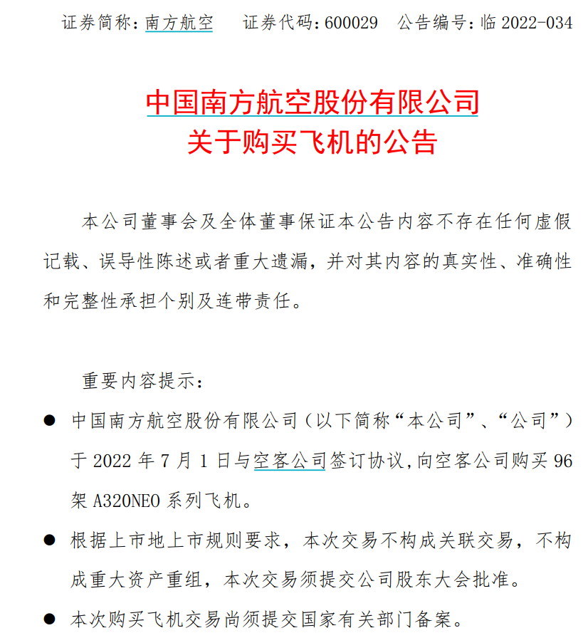 南方航空:7月1日与空客公司签订协议,向空客公司购买96架A320NEO 系列飞机,基本价格约为122.48亿美元。(约为人民币 818.94 亿元)