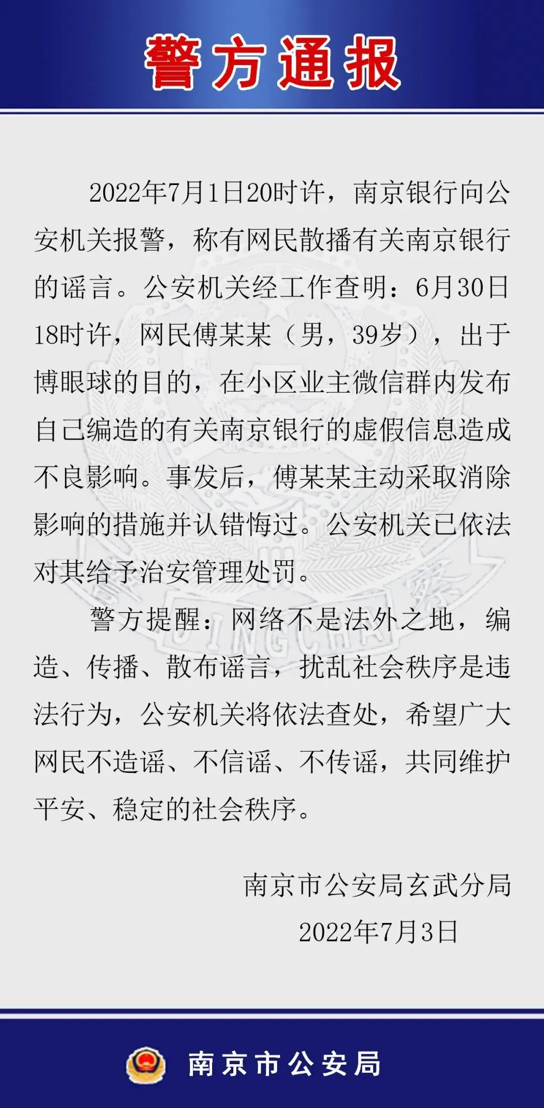 公安机关经工作查明,6月30日,网民傅某某(男,39岁)出于博眼球的目的,在小区业主微信群内发布自己编造的有关南京银行的虚假信息造成不良影响。事发后,傅某某主动采取消除影响的措施并认错悔过。公安机关已依法对其给予治安管理处罚。
