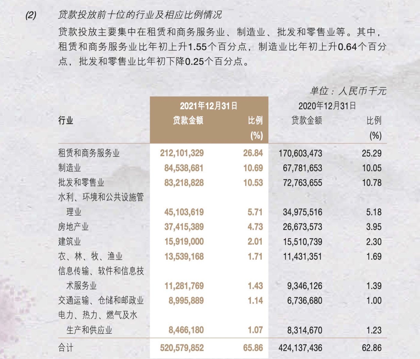 年报显示,2021年该行贷款投放主要集中在租货和商务服务业、制造业批发和零售业等。房地产贷款金额分别为374.15亿元,占比只有4.73%,房地产不良贷款率只有0.08%。