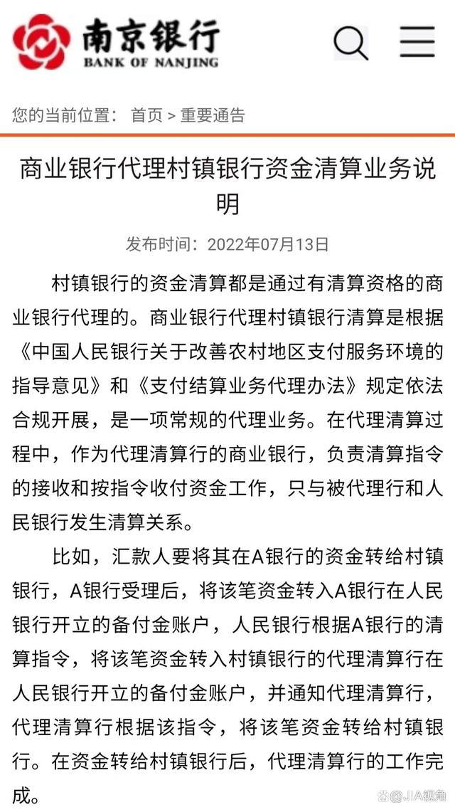 昨天,南京银行发布通告,说明代理河南村镇银行清算业务是怎么一回事,根据通告的内容可以看出,无论是人民银行还是南京银行,都是清楚知道都多笔、总额巨大的资金转入了河南村镇银行。