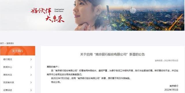 因“南京银行股份有限公司”印章使用年限较长、磨损严重,为便于各项工作顺利开展,我行决定更换印章。新印章名称不变,并已在南京市公安局玄武分局完成备案登记。自2022年7月1日起,启用“南京银行股份有限公司”新章,原印章于同日作废销毁。