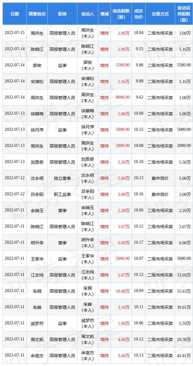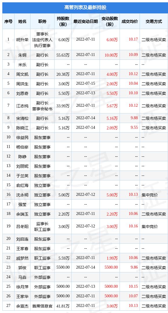 根据7月18日市场公开信息、上市公司公告及交易所披露数据整理,南京银行(601009)最新董监高及相关人员股份变动情况:2022年7月15日公司高级管理人员周洪生共增持公司股份2.0万股,占公司总股本为0.0002%。变动期间公司股价上涨1.01%,7月15日当日收盘报10.04元。