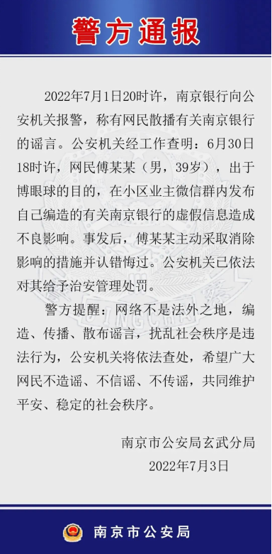 针对相关传闻,南京银行同日发布澄清公告称,“近日,网传南京银行有关不实信息。我行严正声明:相关信息为恶意造谣,我行已经向公安机关报案并将依法追究相关主体的法律责任。” 在这份公告中,南京银行再次强调,目前该行经营管理一切正常。