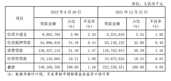 截至2022年6月,南京银行个贷不良率为1.16%,较年初上升0.28个百分点。其中,信用卡透支不良率2.33%,同比上升0.53个百分点,住房抵押贷款不良率0.44%,同比上升0.04个百分点,消费贷款不良率1.57%,上升0.41个百分点,经营性贷款不良率1.08%,同比上升了0.28个百分点。