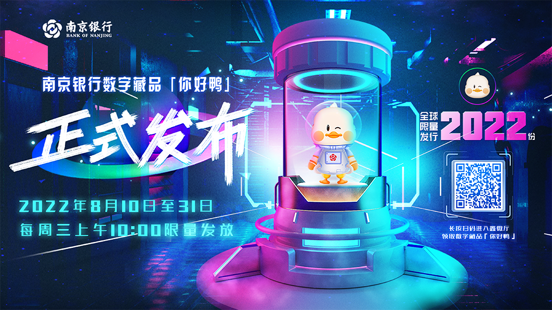「你好鸭」是南京银行结合南京特色“吃鸭”文化以及新生代潮酷活泼的网络文化提炼而成的网络品牌IP形象,是一只可以与年轻客群亲切沟通对话、并能持续为客户传递美好福利的“萌鸭”。本次数字藏品以南京银行品牌IP“你好鸭”为形像基础,精心策划5大系列,共计2022款,每一款都是独一无二的惊喜。