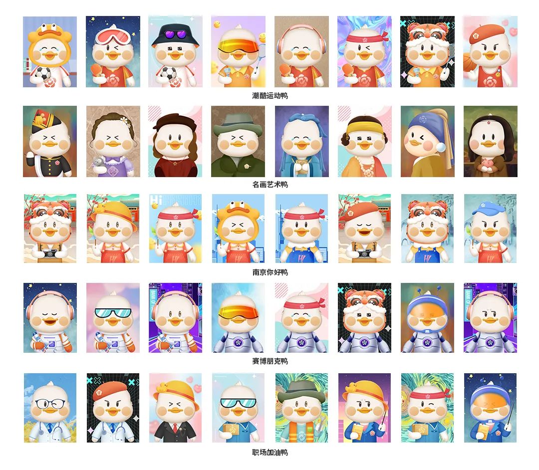 本次数字藏品精心策划了5大系列,通过各类活泼生动的萌鸭卡通形象传递了南京银行独有的品牌理念。