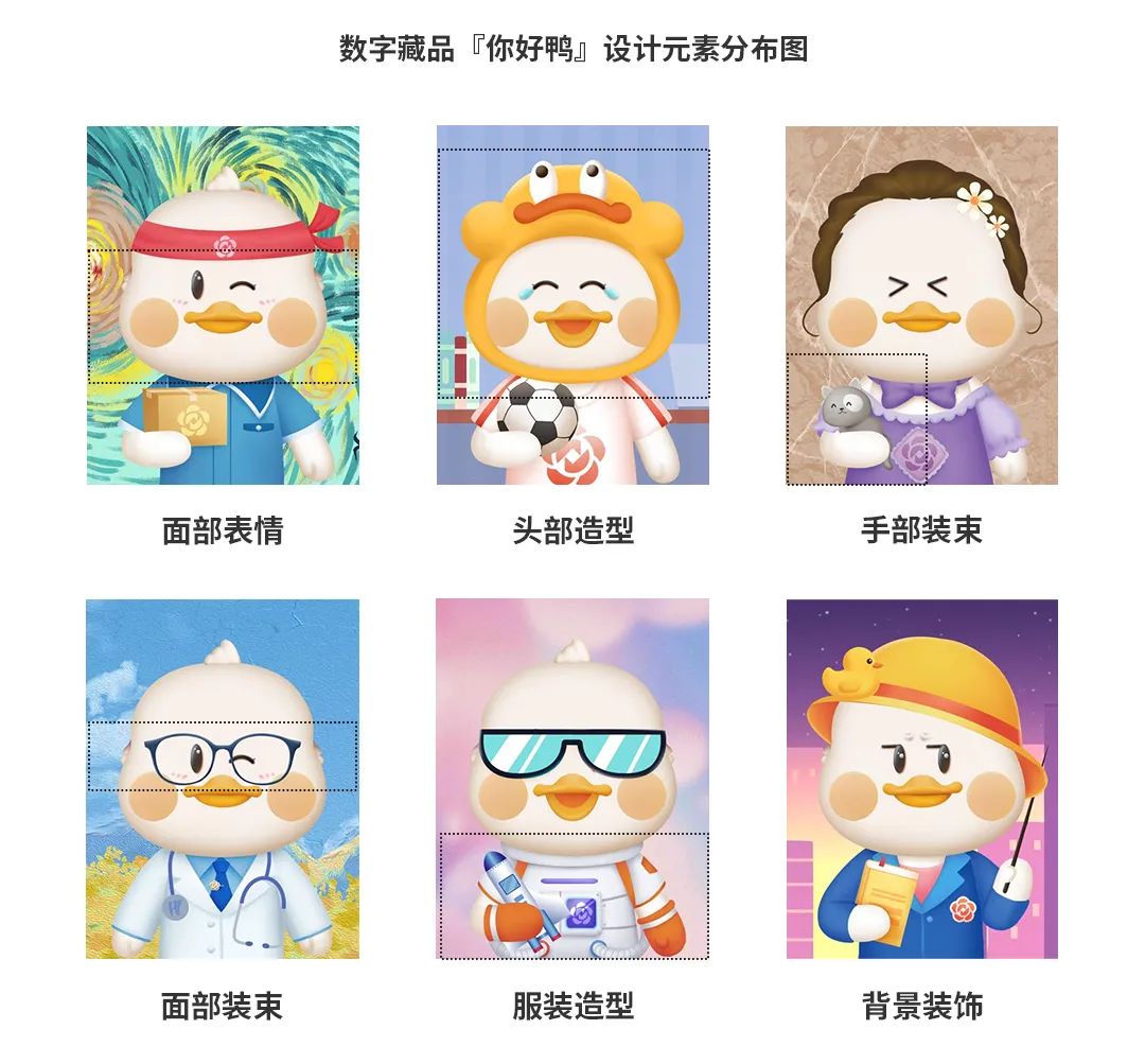 设计师们基于「你好鸭」的基础形象进行全新解构,从头部装饰、服饰、背景、面部表情这4大元素部位着手进行改造与延展,确保每一款萌鸭形象都趣味满满~
