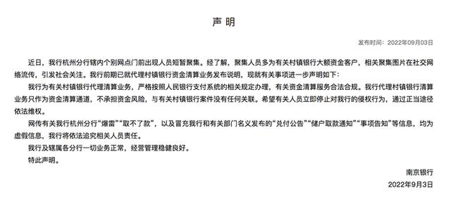9月3日,南京银行发表声明称,网传有关该行杭州分行“爆雷”“取不了款”,以及冒充该行和有关部门名义发布的“兑付公告”“储户取款通知”“事项告知”等信息,均为虚假信息,将依法追究相关人员责任。该行及辖属各分行一切业务正常,经营管理稳健良好。