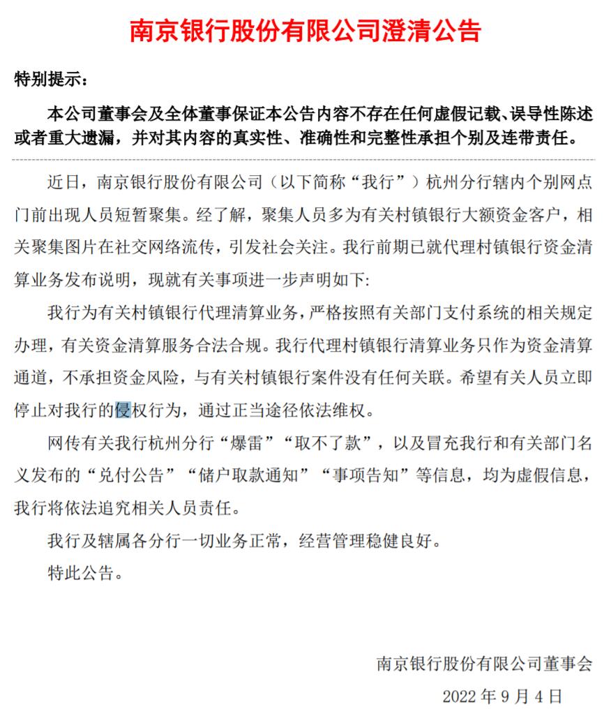 昨日晚间,南京银行(601009)发布公告,近日,南京银行股份有限公司(以下简称“我行”)杭州分行辖内个别网点门前出现人员短暂聚集。经了解,聚集人员多为有关村镇银行大额资金客户,相关聚集图片在社交网络流传,引发社会关注。南京银行声明称,网传有关该行杭州分行“爆雷”“取不了款”,以及冒充我行和有关部门名义发布的“兑付公告”“储户取款通知”“事项告知”等信息,均为虚假信息,将依法追究相关人员责任。