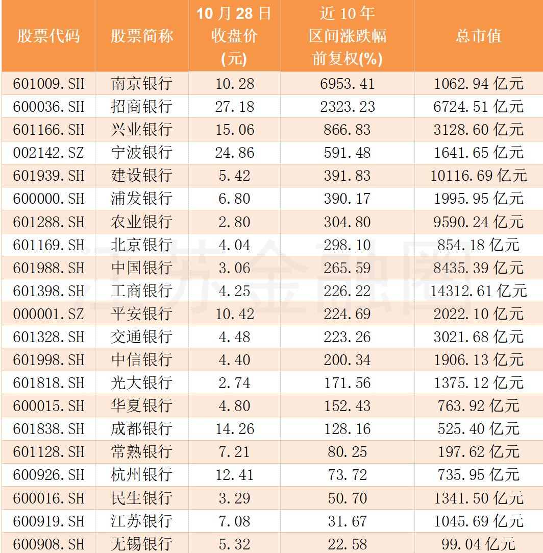据金融小强统计,近10年以来(2012年10月29日~今年10月28日),42家A股上市银行有22家市值获得正收益,占比超过一半,其中,南京银行以69.53倍的市值涨幅高居第一。