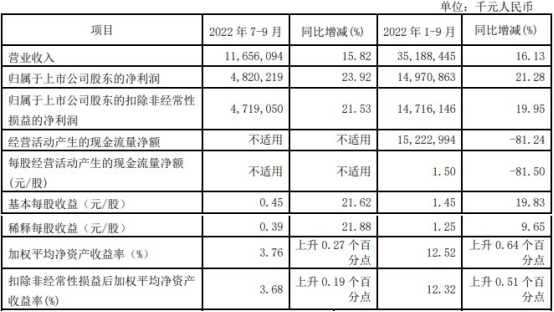 单季度来看,今年第三季度,南京银行实现营业收入116.56亿元,同比增长15.82%;实现归属于上市公司股东的净利润48.20亿元,同比增长23.92%;实现归属于上市公司股东的扣除非经常性损益的净利润47.19亿元,同比增长21.53%;基本每股收益为0.45元/股,同比增长21.62%;加权平均净资产收益率为3.76%,比上年同期上升0.27个百分点;扣除非经常性损益后加权平均净资产收益率为3.68%,比上年同期上升0.19个百分点。