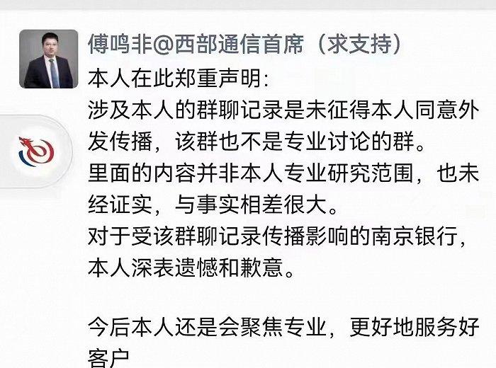 聊天记录发酵后,傅鸣非在发朋友圈紧急致歉,声明称,相关群聊记录未征得本人同意外发传播,内容并非其专业研究范围,也未经证实,与事实相差很大。傅鸣非深表遗憾和歉意。