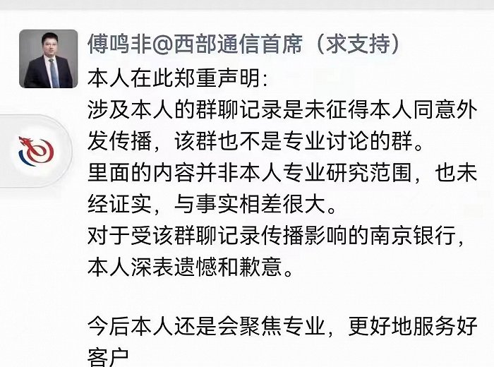 此后,一则涉及南京银行的群聊记录在社交媒体快速发酵,交流内容为西部证券通信首席傅鸣非关于南京银行的一些判断与风险提示。