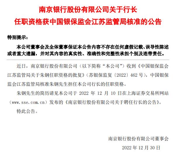 南京银行去年12月31日发布关于行长任职资格获中国银保监会江苏监管局核准的公告。近日,南京银行股份有限公司(简称“南京银行”,601009.SH)收到《中国银保监会江苏监管局关于朱钢任职资格的批复》(苏银保监复〔2022〕462号),中国银保监会江苏监管局核准朱钢担任南京银行行长的任职资格。