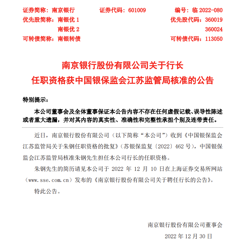 近日,南京银行发布公告,南京银行近日收到《中国银保监会江苏监管局关于朱钢任职资格的批复》(苏银保监复〔2022〕462 号),中国银保监会江苏监管局核准朱钢担任该公司行长的任职资格。