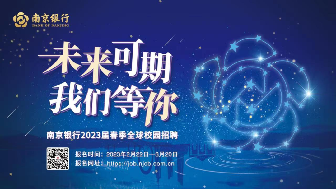 “未来可期,我们等你”。一年一度的南京银行2023届春季全球校园招聘正在进行中,面向全球学子发出盛情邀请。