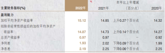 2022年,南京银行加权平均净资产收益率为15.12%,比上年上升0.27个百分点;扣除非经常性损益后的加权平均净资产收益率为14.87%,比上年上升0.14个百分点。