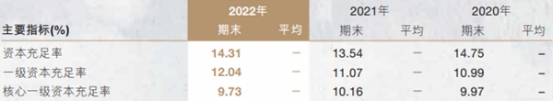 2022年末,南京银行资本充足率为14.31%,上年末为13.54%;一级资本充足率为12.04%,上年末为11.07%;核心一级资本充足率为9.73%,上年末为10.16%。