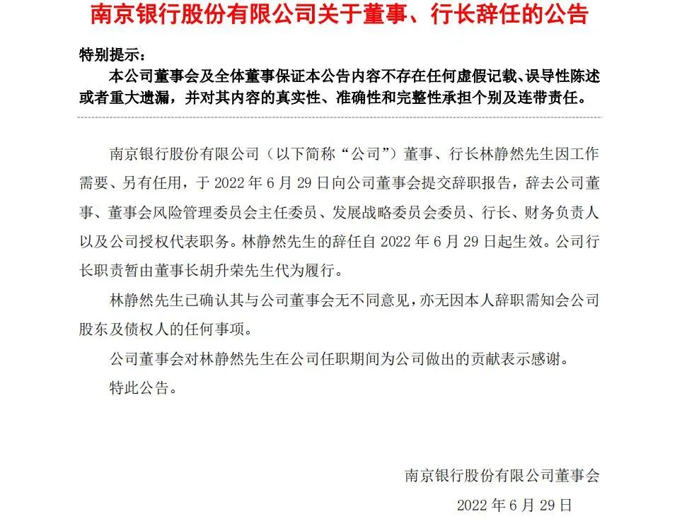 2022年6月29日晚间,南京银行公告称,该行董事、行长林静然因工作需要、另有任用,已于当日向公司董事会提交辞职报告,辞去公司董事、董事会风险管理委员会主任委员、发展战略委员会委员、行长、财务负责人以及公司授权代表职务。