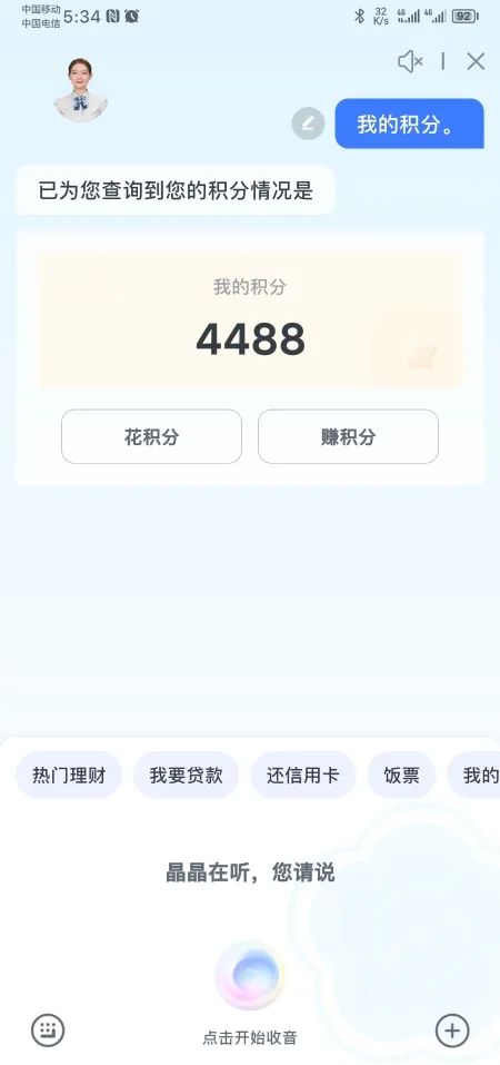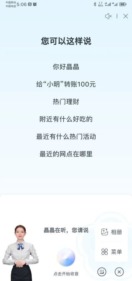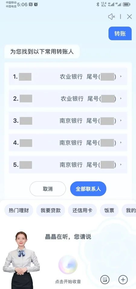 在南京银行APP7.0中,晶晶可通过文字、语音、图片、视频等多种方式与客户进行交互,另外晶晶还支持多轮对话,客户可在不打断对话流程的情况下,完成转账、积分查询、余额查询等业务办理。
