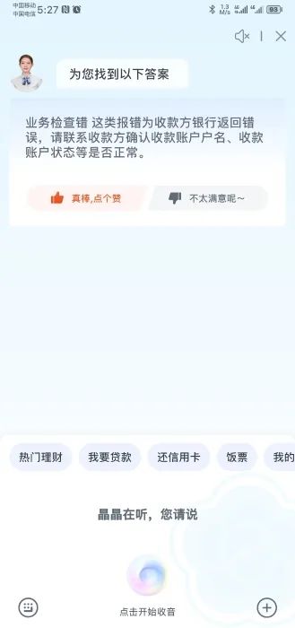 南京银行APP7.0深入挖掘转账模块的客户痛点,实现who、why、how的断点服务模式,晶晶对客户在转账过程中遇到的问题进行实时监测,根据客户信息、具体问题情况,准确快速提供解决方案。同时对无法解决的问题,将相应数据提供给客服中心,实现数据的一体化管理。