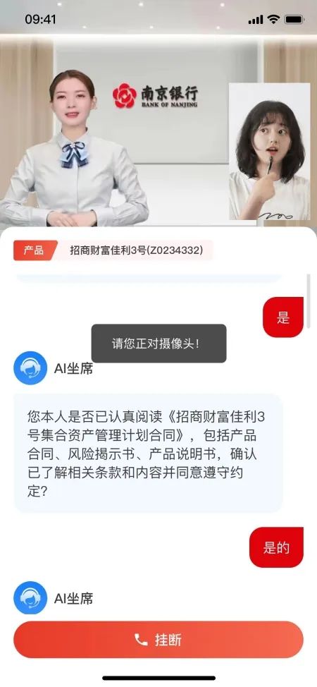 南京银行APP7.0中,为进一步扩大金融科技的运用领域,防范“飞单”风险,减少操作风险等目的,我行融合人物形象模拟、语音识别合成、自然语言处理、机器学习等多项AI技术,将AI与远程视频相结合,实现私行代销流程线上化,将科技与业务、场景紧密结合。客户在南京银行APP上自助发起产品购买交易后,晶晶首先对其风险承受能力、合格投资者状态等信息进行智能识别,同时与客户进行实时互动交流,进一步揭示产品信息、揭示风险、明确客户意愿等。该业务打破时间与空间的限制,提升了客户体验,提高产品交易效率,并且减少了网点运营压力。