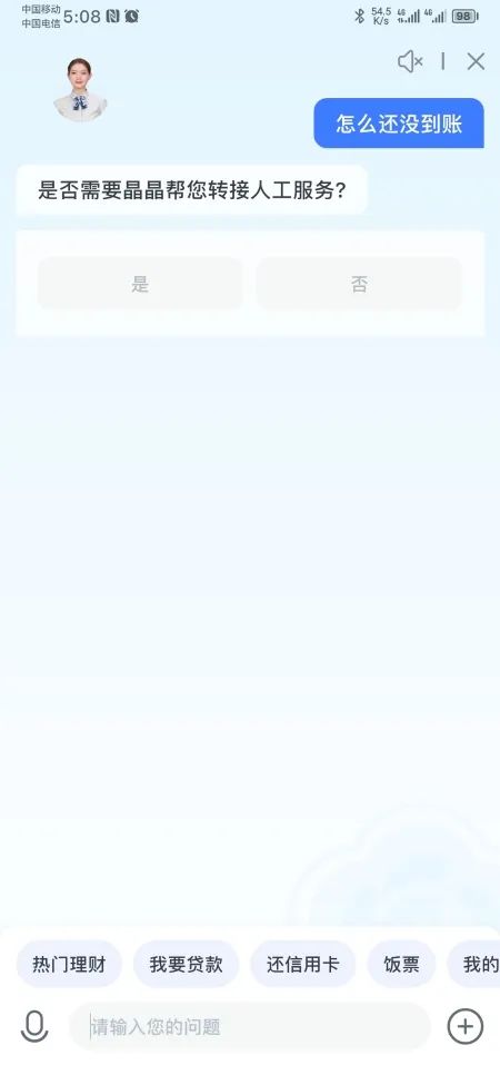 南京银行APP7.0以晶晶为服务载体,对话机器人为大脑,将搜索、智能客服、人工客户等服务能力有效结合,快速识别客户意图,为客户提供功能导航、问题答疑等场景服务。同时晶晶还可以与人工客服协同办公,使APP中服务流程更加高效、精准。