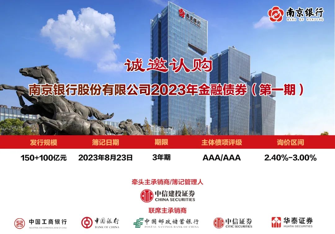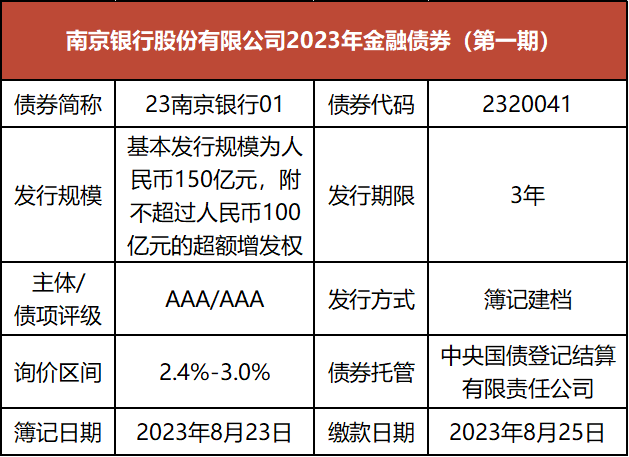 2023年8月23日,南京银行股份有限公司将在全国银行间债券市场发行2023年普通金融债(第一期),期限为3年,基本发行规模为人民币150亿元,附不超过人民币100亿元的超额增发权,主体与债项评级均为AAA,本次债券募集的资金将用于优化中长期资产负债匹配结构,增加稳定中长期负债来源并支持中长期资产业务的开展。