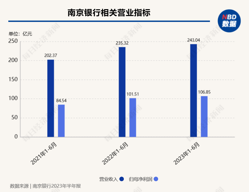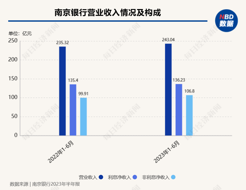 8月30日,南京银行发布2023年半年度报告。上半年,南京银行(SH601009,股价7.92元,市值819.2亿元)实现营业收入超240亿元,同比增长3.28%。其中,非利息净收入达106.8亿元,同比增长近6.89%,在营收中占比近44%,同比上升1.48个百分点;实现归属于上市公司股东净利润超106.85亿元,同比增长5.26%。