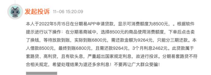 有用户在平台上表示“本人在平台贷款8500元,合同明确写明年利率7.5%,分12期,每期还款却要803.76元,达到36%年利率,与合同明确不符,高利贷行为,要求退还利息。