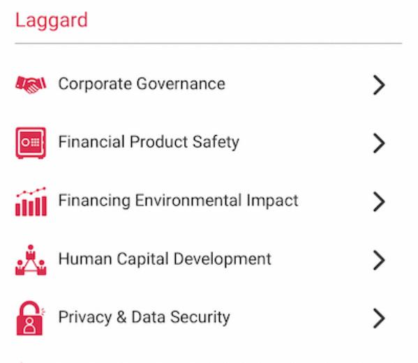 不光如此,MSCI还揭露了南京的5项落后议题,分别是“企业治理、金融产品安全、绿色金融、人力资本发展、隐私和数据安全”。