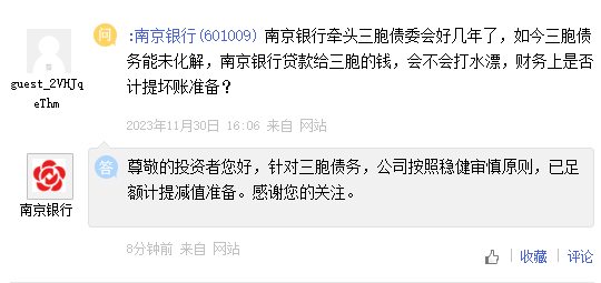 对此,南京银行15日回复表示,针对三胞债务,公司按照稳健审慎原则,已足额计提减值准备。
